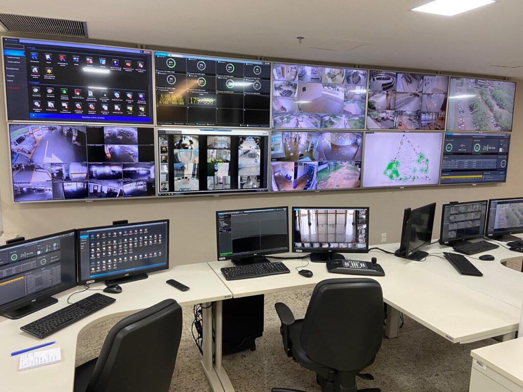 Sala de controle unificada com câmeras, sensores e dados em tempo real.