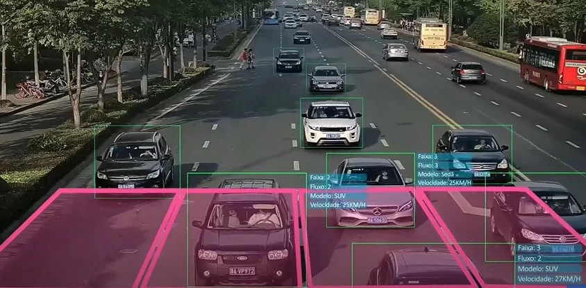 Monitoramento de fluxo urbano, estacionamento e transporte público.